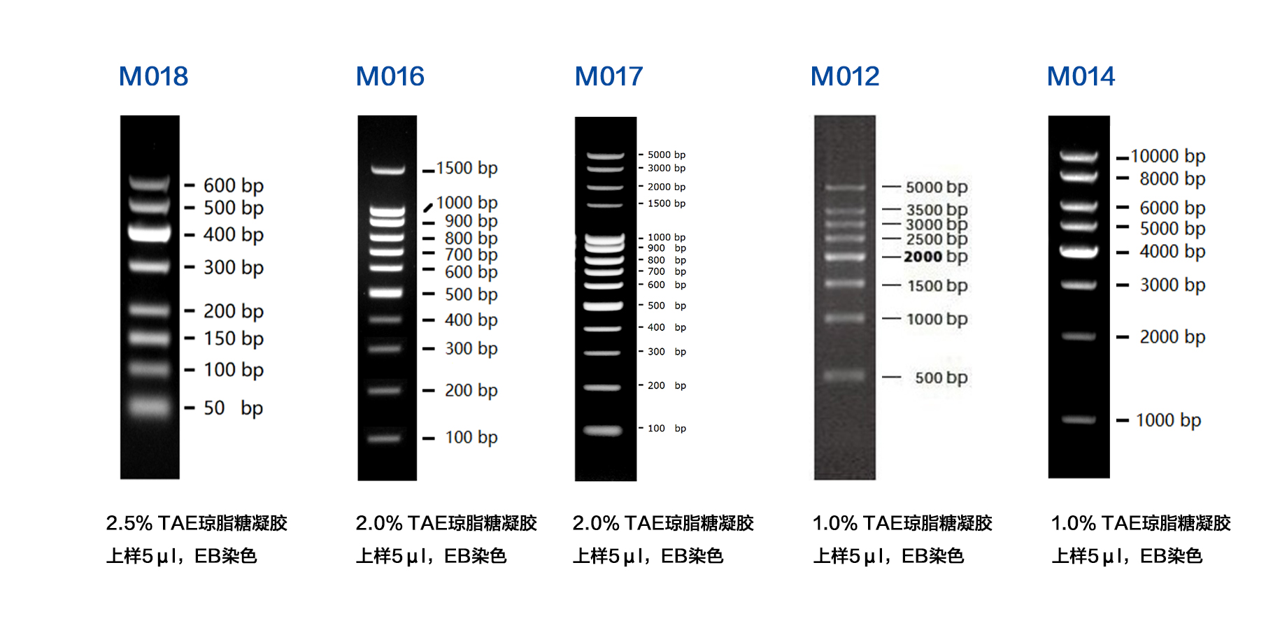 本產品為預混有 1x 上樣緩沖液的即用型 DNA 分子量標準,由 8 條線狀雙鏈 DNA 條帶組成,適用于對 500-5000 bp 的雙鏈 DNA 分子大小的估算和粗略定量。本產品的 8 條帶分別為 500、1000、1500、2000、2500、3000、3500 和 5000 bp 。其中 2000 bp 條帶濃度最大,為 20 ng/µl,其余條帶濃度約為 10 ng/µl。
