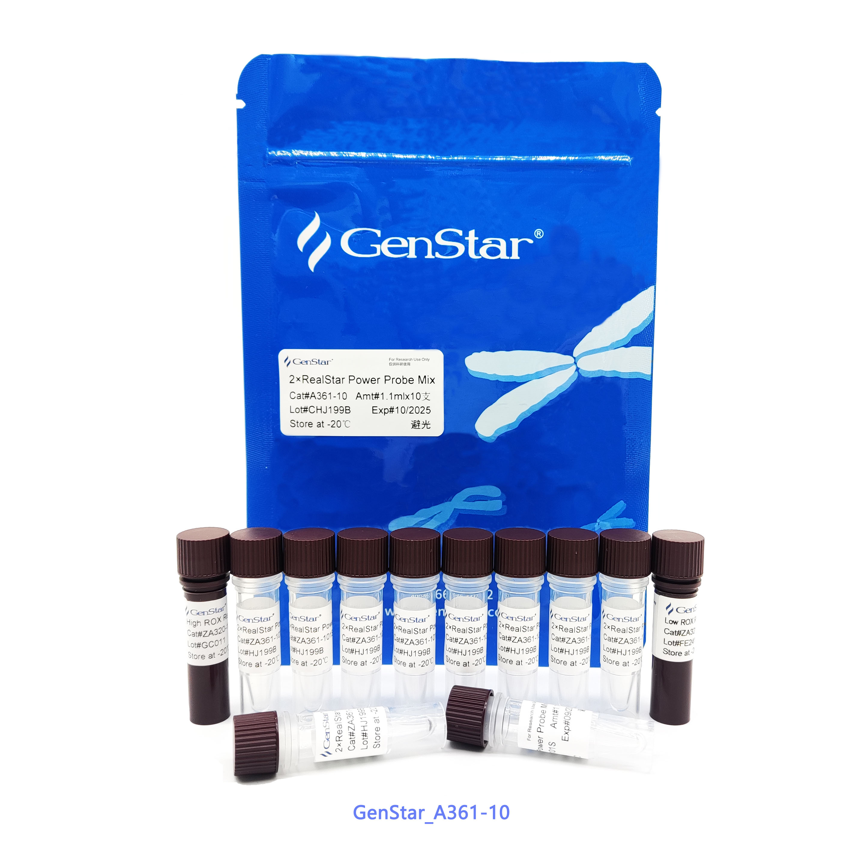 本產品是專用于探針法(TaqMan,Molecular Beacon 等)實時熒光定量的預混體系。產品含有優化濃度的 GenStar Power HSTaq DNA Polymerase、dNTPs、Mg2+、反應緩沖液和穩定劑等成分。Power HSTaq DNA Polymerase 在 75℃ 以下沒有活性,從而有效避免在常溫條件下由引物和模板非特異性結合或引物二聚體而產生的非特異性擴增,酶的激活需要 95℃ 孵育 10 min。反應體系可在室溫下配制,無需在冰上完成,操作方便。主要用于基因組 DNA 靶序列和 RNA 反轉錄后 cDNA 靶序列的檢測,如基因表達分析、拷貝數分析、SNP 基因型分析等,適用于不同類型探針法熒光定量 PCR。