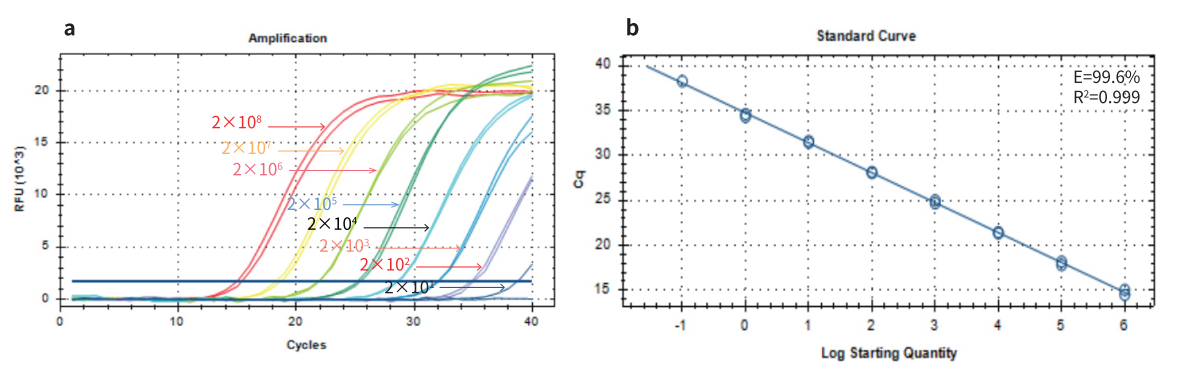 對濃度范圍為 2×101~2×108 copies/μl 的某 DNA 病毒陽性質(zhì)粒,用GenStar #A392 進行 qPCR 檢測,結(jié)果顯示,GenStar #A392 可檢測出最低 DNA 量為 20 copies/μl。