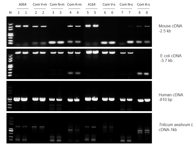 分別以人、小鼠、E.coli cDNA 為模板,使用 A064/A164、Com V、Com N、Com K 進(jìn)行不同長度片段擴(kuò)增。結(jié)果顯示,A064/A164 對不同種屬來源不同長度的 cDNA 片段兼容性強(qiáng),均能良好擴(kuò)增