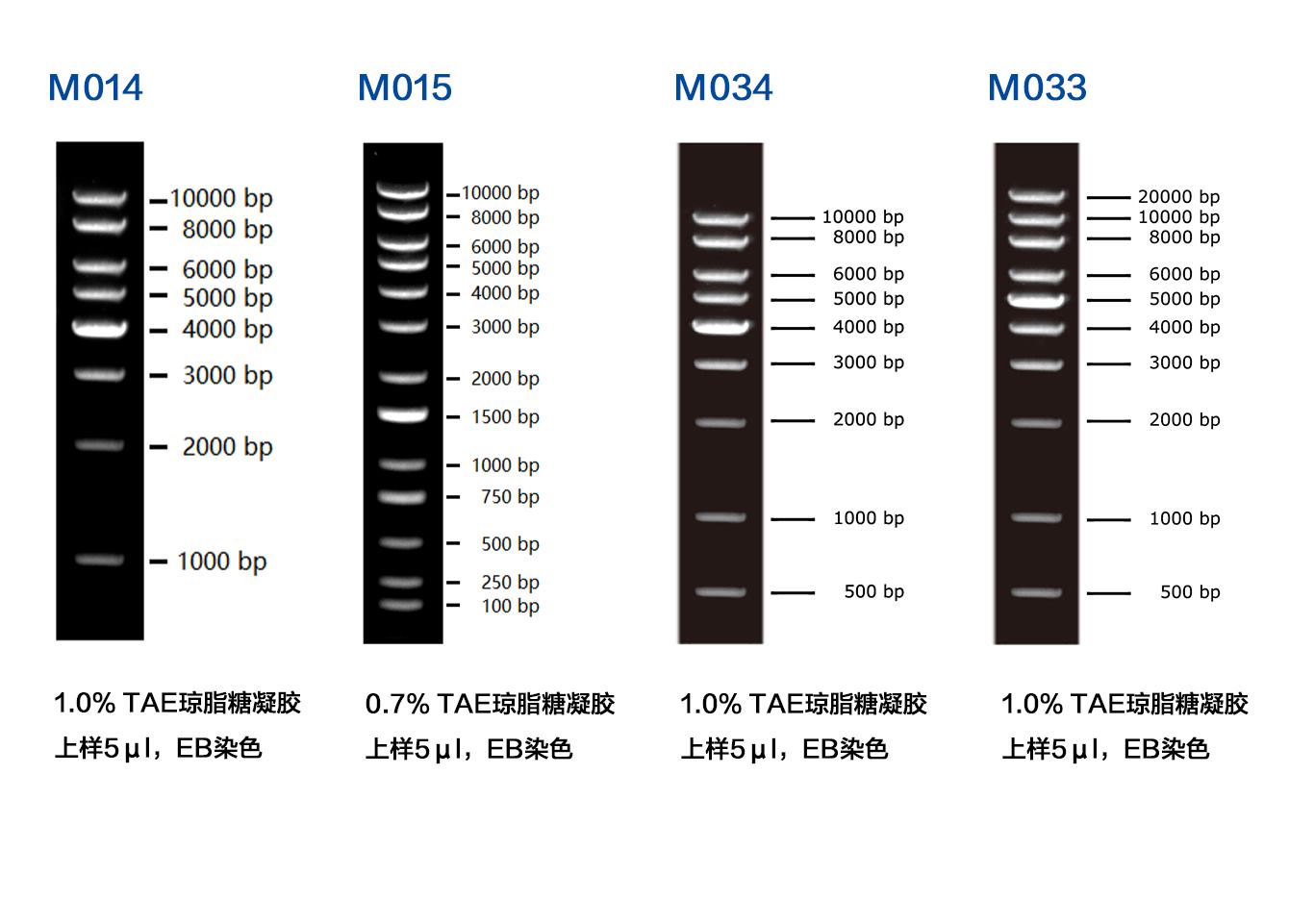 本產品為預混有 1x 上樣緩沖液的即用型 DNA 分子量標準,由 13 條線狀雙鏈 DNA 條帶組成,適用于對 100 bp 至 10 kb 的雙鏈 DNA 分子大小的估算和粗略定量。本產品的 13 條帶分別為 100,250,500,750,1000,1500,2000,3000,4000,5000,6000,8000 和 10000 bp。其中 1500 bp、750 bp 條帶濃度最大,為 20 ng/µl,其余條帶濃度約為 10 ng/µl。