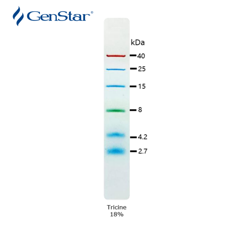 本產品包含了 2.7-40 kDa 的 6 種高度純化并預染的重組蛋白質。6 種條帶分別為:2.7、4.2、8、15、25、40 kDa。其中 8 kDa 條帶為綠色預染條帶,40 kDa 條帶為橙紅色預染條帶,方便判斷各個條帶準確位置。