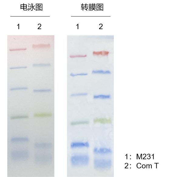 分別使用GenStar #M230 和 Com T進行電泳,Tricine 膠濃度18%,上樣量5 μl、電壓150 V,電泳100 min,電泳結束后進行轉膜實驗,轉膜電壓200 V、時間60 min。結果顯示,M230電泳和轉膜條帶均清晰可見,小條帶效果優于Com T。