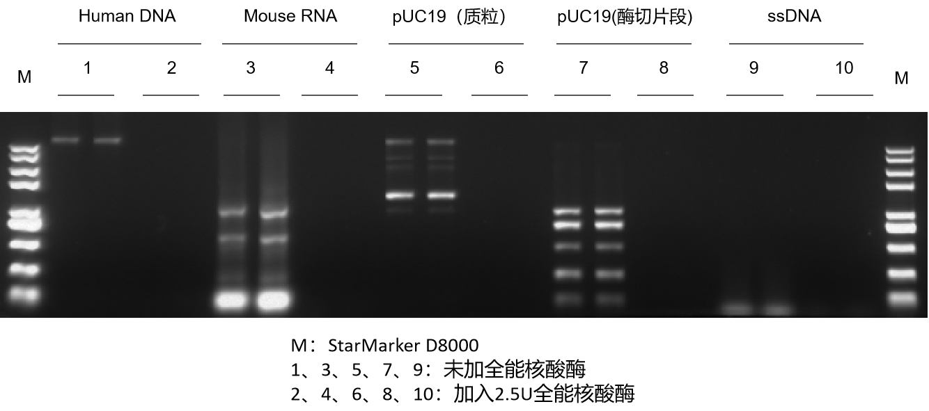 在 20 μl 體系中,使用 2.5 U GenStar #A511對 1 μg不同類型的 DNA 和 RNA 37℃ 孵育 40 min。結果顯示,A511 可高效降解不同類型 DNA 和 RNA。