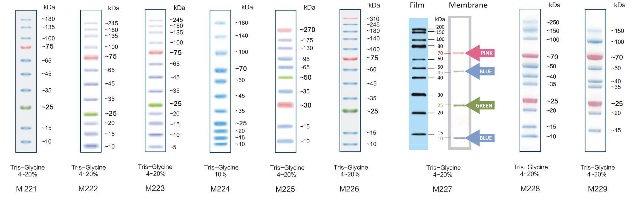 本產品由跨度從 10-270 kDa 的 10 種高度純化預染的重組蛋白質組成,各條帶濃度約為 0.1-0.5 mg/ml。其中 30 kDa 和 270 kDa 條帶為加強條帶,方便判斷各個條帶的準確位置。本產品適合作為 SDS-PAGE 電泳時,變性蛋白樣品的分子量參照,并可實時觀察蛋白樣品的電泳分離狀況,也可用于檢測 Western blot 的轉膜效率。由于共價結合的染料會影響蛋白質分子的電泳遷移率,本產品僅適于粗略地估計目的蛋白樣品的分子量。