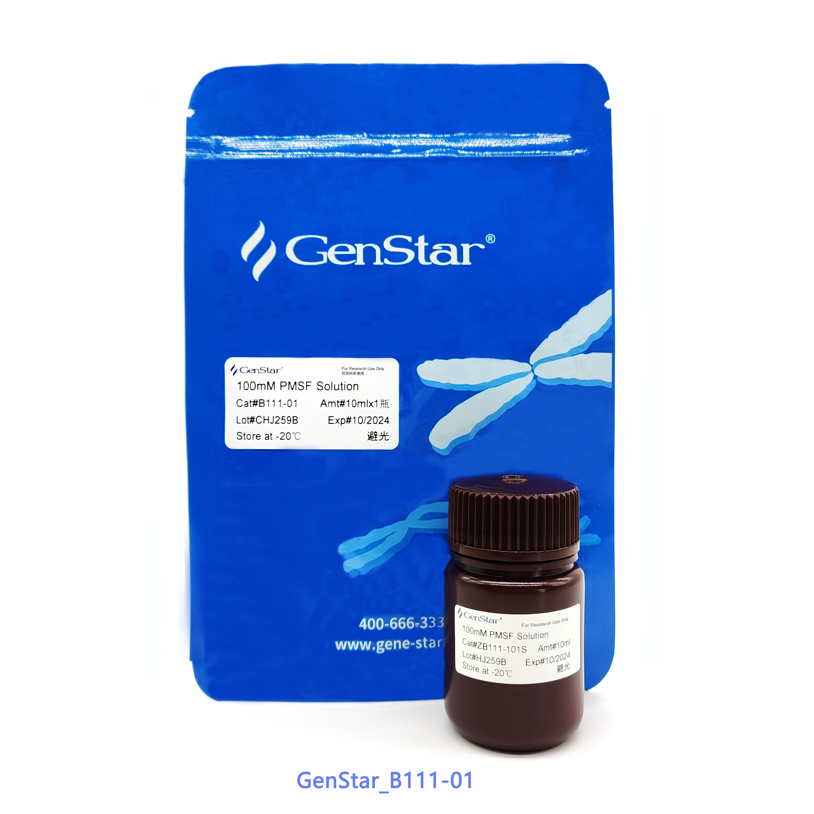 PMSF(苯甲基磺酰氟)可抑制絲氨酸蛋白酶磺化的絲氨酸殘基的活性部位,是絲氨酸蛋白酶(如胰蛋白酶,胰凝乳蛋白酶,凝血酶)和巰基蛋白酶(如木瓜蛋白酶)等酶的不可逆非特異性抑制劑。但不抑制金屬蛋白酶、大多數的半胱氨酸蛋白酶或天冬氨酸蛋白酶。故 PMSF 通常用于制備細胞裂解液,有助于保護樣品免受蛋白酶及其他酶的消化功能的影響。PMSF 也可用于在進行 Western blotting 之前從組織和細胞中制備蛋白質提取物。 本產品為 100 mM 的儲存液,溶劑為異丙醇。通常,1 mM 最終濃度能提供足夠的蛋白酶保護。使用時建議按照 1:100 添加至 RIPA 裂解液系列產品(GenStar#E121、E122、E123)、NP-40 裂解液(GenStar#E124)、Western 及免疫沉淀用細胞裂解液(GenStar#E125)。
