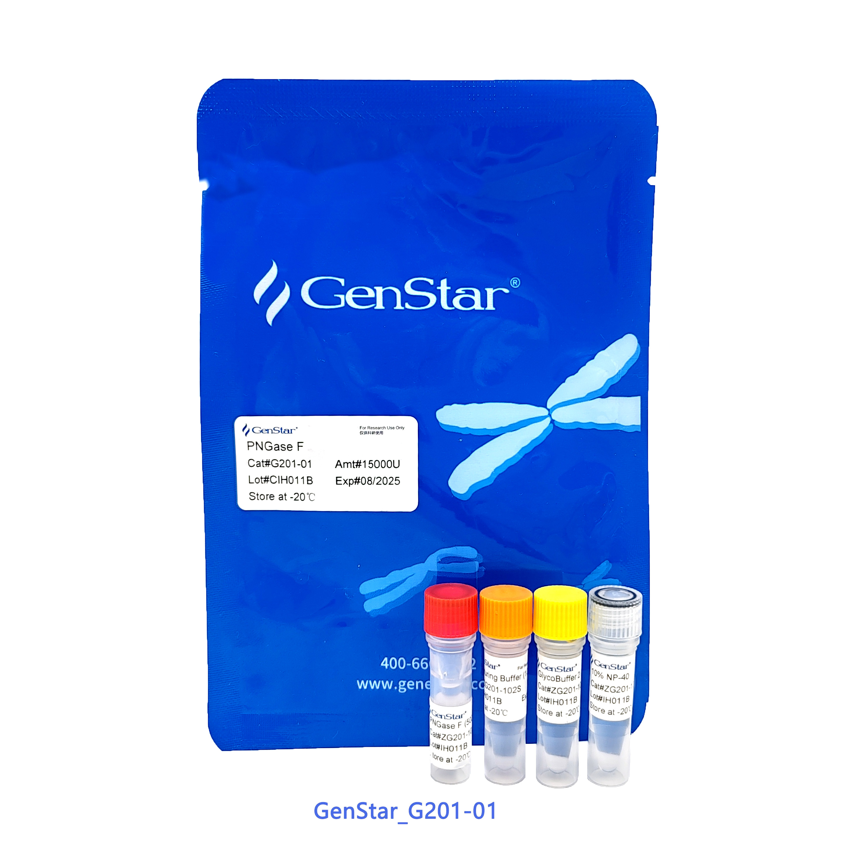 肽N-糖苷酶 F(PNGase F)是一種酰胺水解酶,克隆自和平空間站伊麗莎菌(Elizabethkingia miricola, formerly Flavobacteriummeningosepticum),在大腸桿菌中重組表達。PNGase F 可以裂解由天冬酰胺連接的高甘露糖,及雜合和復雜的寡糖糖蛋白。PNGase F 切割位點為糖蛋白內側 N-乙酰葡萄糖胺(GlcNAc)和天冬酰氨殘基之間的酰胺鍵,同時將酶解后蛋白上的天冬氨酰轉化為天冬氨酸,而不會去除常見植物糖蛋白上含有核心 α-(1,3)-巖藻糖連接的寡糖。本產品常應用于抗體及其相關蛋白完全去糖基化。