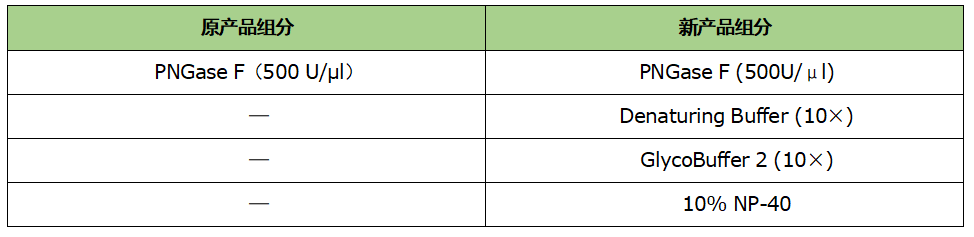 自 2024.08 起,G201 產品進行了組分變更。變更后的產品提供肽 N-糖苷酶 F 適配的三種反應 buffer 即 Denaturing Buffer (10×)、GlycoBuffer 2 (10×)和 10% NP-40,使產品使用更加便捷。