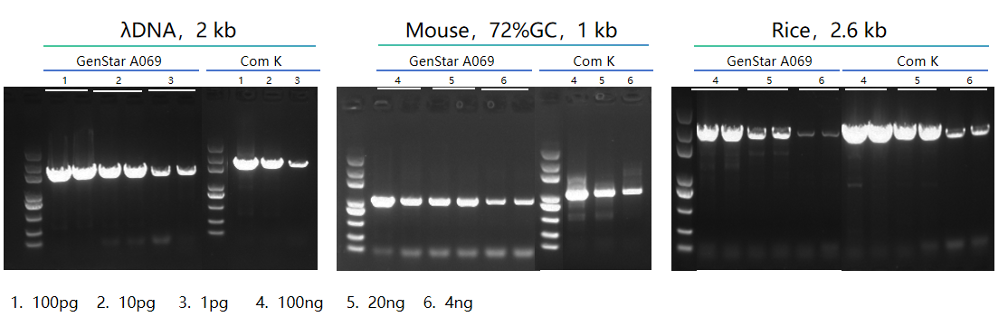 GenStar 2×SuperNova HTS PCR Mix(#A069) 靈敏度與 Com K 相當,對于簡單模板(如 λDNA),模板濃度可檢測低至 pg 級。