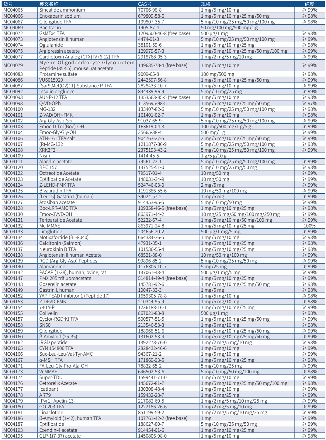 多肽是以氨基酸為基本單位,經肽鍵連接在一起形成的化合物。肽是人體重要的生理調節物,可全面調節人體生理功能,增強和發揮人體生理活性,具有重要的生物學功能。目前被廣泛用于疾病研究、藥物及疫苗開發等領域中。