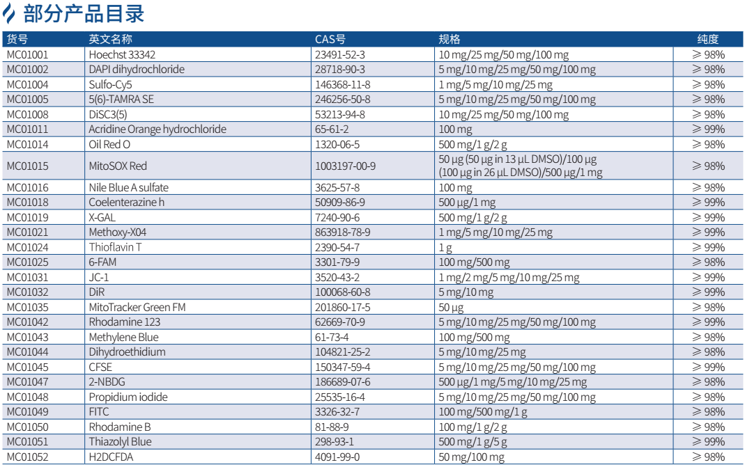 GenStar 目前擁有近 200 種熒光染料試劑,覆蓋細胞染色分析、動物活體成像、生物偶聯、標記化學等眾多熱門研究領域,具有靈敏度高,穩定性好,熒光強度高等特點。