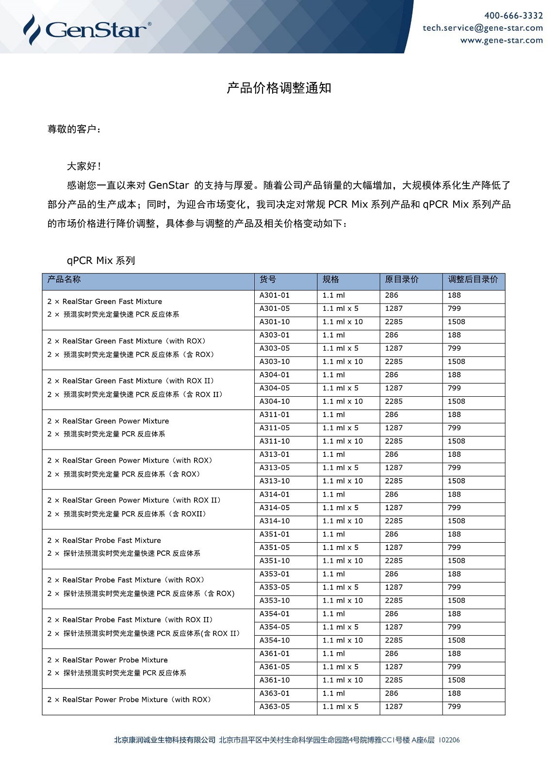 產品價格調整通知