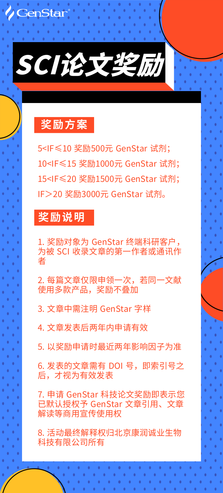 GenStar 自成立以來,一直深耕于分子生物學領域上游核心原料及配套體系的研發,服務了全國數千家實驗室的科研人員。使用 GenStar 產品的 SCI 論文總數已達千余篇,其中包含《Nature》、《Science》、《Cell》等高水平的學術期刊。為了感謝廣大客戶的支持與信任,GenStar 繼續推行發表科技論文獎勵機,使用 GenStar 產品發表科技論文的人員均可申請。希望更多新老客戶參與其中,期待和您一起分享成功的喜悅。
