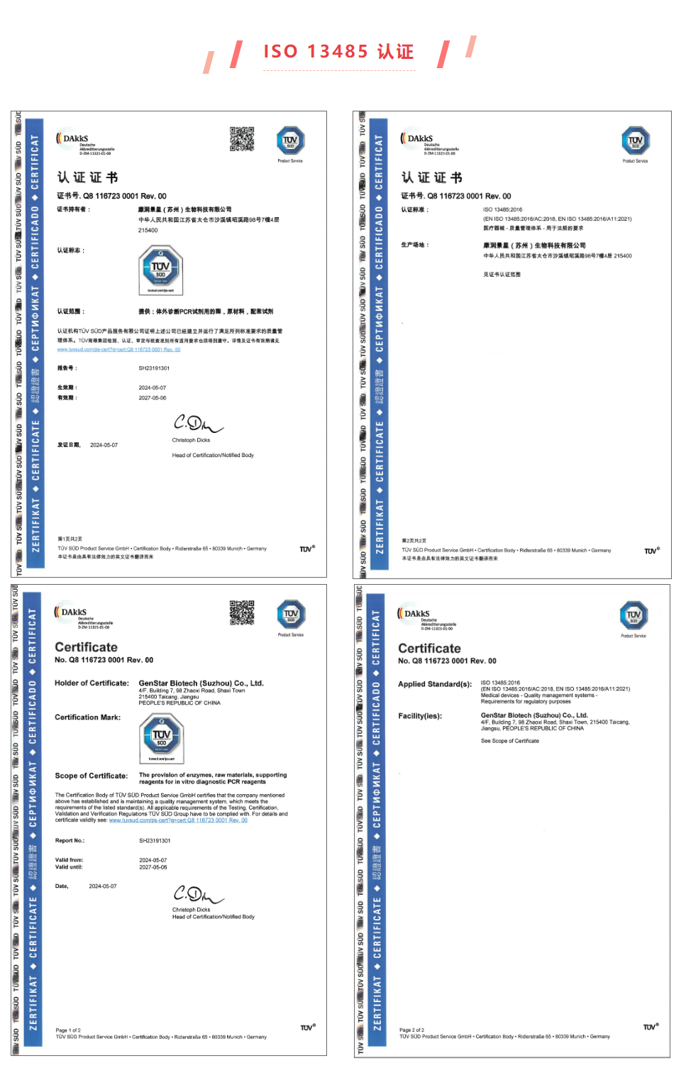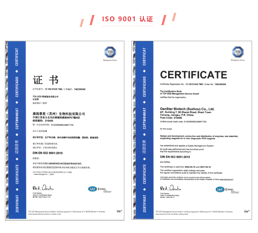 近日,康潤景星(蘇州)生物科技有限公司(GenStar全資子公司)經國際第三方檢測認證機構TÜV南德意志集團(以下簡稱“TÜV南德”)的嚴格審查,再次通過ISO9001:2015質量管理體系ISO13485:2016醫療器械質量管理體系認證審核,并獲得證書。